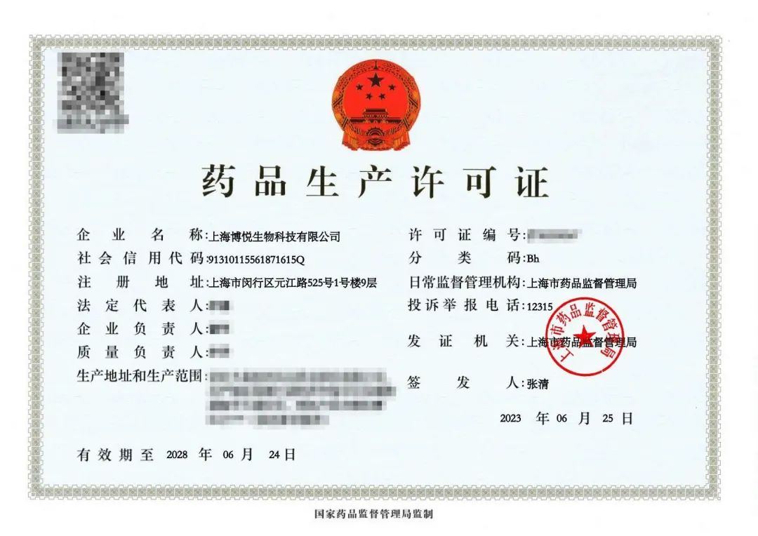 2023年6月25日,上海博悅生物科技有限公司獲得上海市藥品監(jiān)督管理局頒發(fā)的《藥品生產(chǎn)許可證》B證。在MA